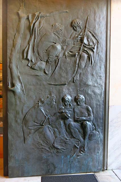 A porta central (fotos abaixo), chamada da Paz, compõe-se de dezesseis cenas. Destacam-se aspectos da travessia do mar e da ocupação do solo. É recordado o trabalho de operários, artesãos e agricultores. Os cestos cheios evocam a generosidade da terra, e as pombas representam a paz. Outras imagens evocadas são as da vindima, da fraternidade e da maternidade.