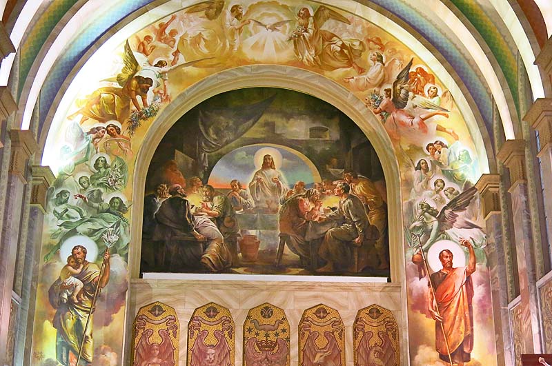 Em 1951, Aldo Locatelli inicia as pinturas da Igreja com o mural da Santa Ceia (foto acima), de 90 metros quadrados de área , ladeada pela Aparição do Sagrado Coração de Jesus a Santa Margarida Maria Alecoque, à esquerda, e a Aparição de Nossa Senhora de Caravaggio à vidente Joaneta, à direita.