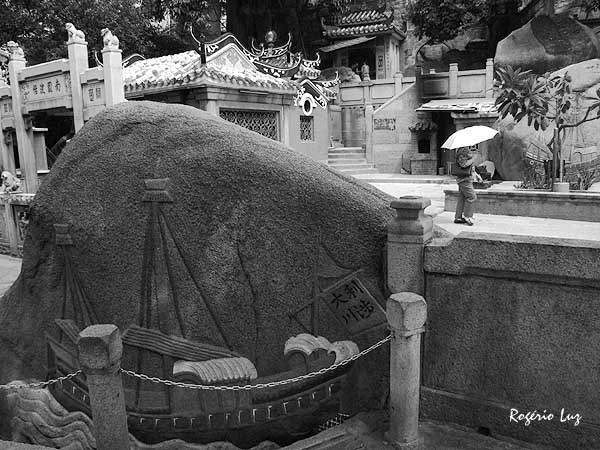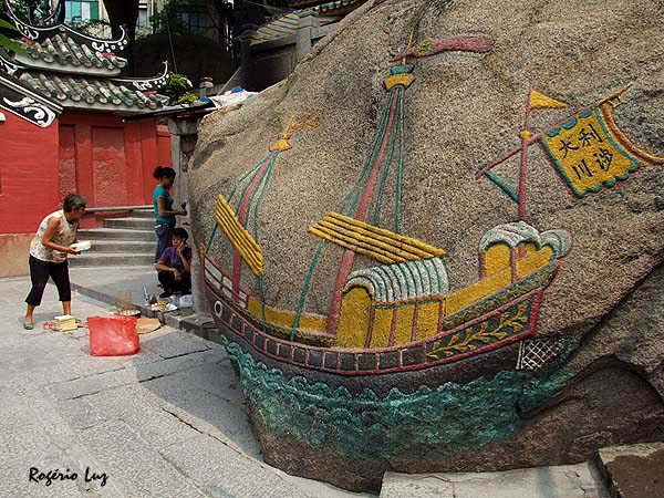 Esta rocha, ao contrário da Tái Ut (vide postagem), é mais conhecida pois fica logo na entrada do Templo da Barra, ou Templo Amá que se atribui a origem do nome de Macau, e abreviatura do nome da deusa Neáng-Má, cuja história é contada mais abaixo por Padre Teixeira.