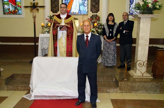Chicói a aguarda no altar com o Padre Rodrigo Sote e os padrinhos do casamento Manuel e Yolanda Ramos
