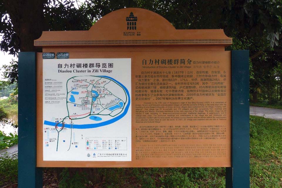 (M.V.Basílio): “Depois da ida a Sanchoão, fomos no dia seguinte visitar uma das aldeias de Kaiping – a aldeia de Zili. Kaiping (ou Hoi Peng, em cantonense) tem sido tradicionalmente uma região de grande emigração no exterior e, consequentemente, emigrantes chineses que conseguiram mudar de vida e fazer alguma fortuna em terras estrangeiras, designadamente na Austrália e na América, retornaram à sua terra natal com novas ideias e tendências, assimiladas no exterior, e mandaram construir, sobretudo em finais do século XIX e princípios do século XX, as tão características edificações, conhecidas por “Kaiping diaolou” (開平碉樓), cuja função era servir como habitação e como estrutura defensiva contra ataques de malfeitores. Em 2007, a UNESCO inscreveu o Kaiping Diaolou e Aldeias como Património Mundial, por incorporar uma fusão complexa e extravagante de formas estruturais e decorativas chinesas e ocidentais”.