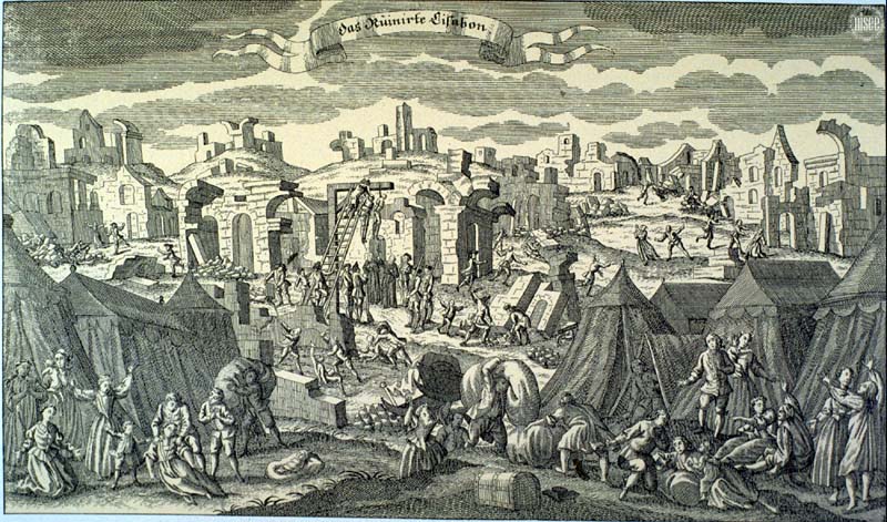 Ruínas de Lisboa. Após o terramoto os sobreviventes viveram em tendas nos arredores da cidade, como ilustra esta gravura alemã de 1755. (Wikimedia Commons)
