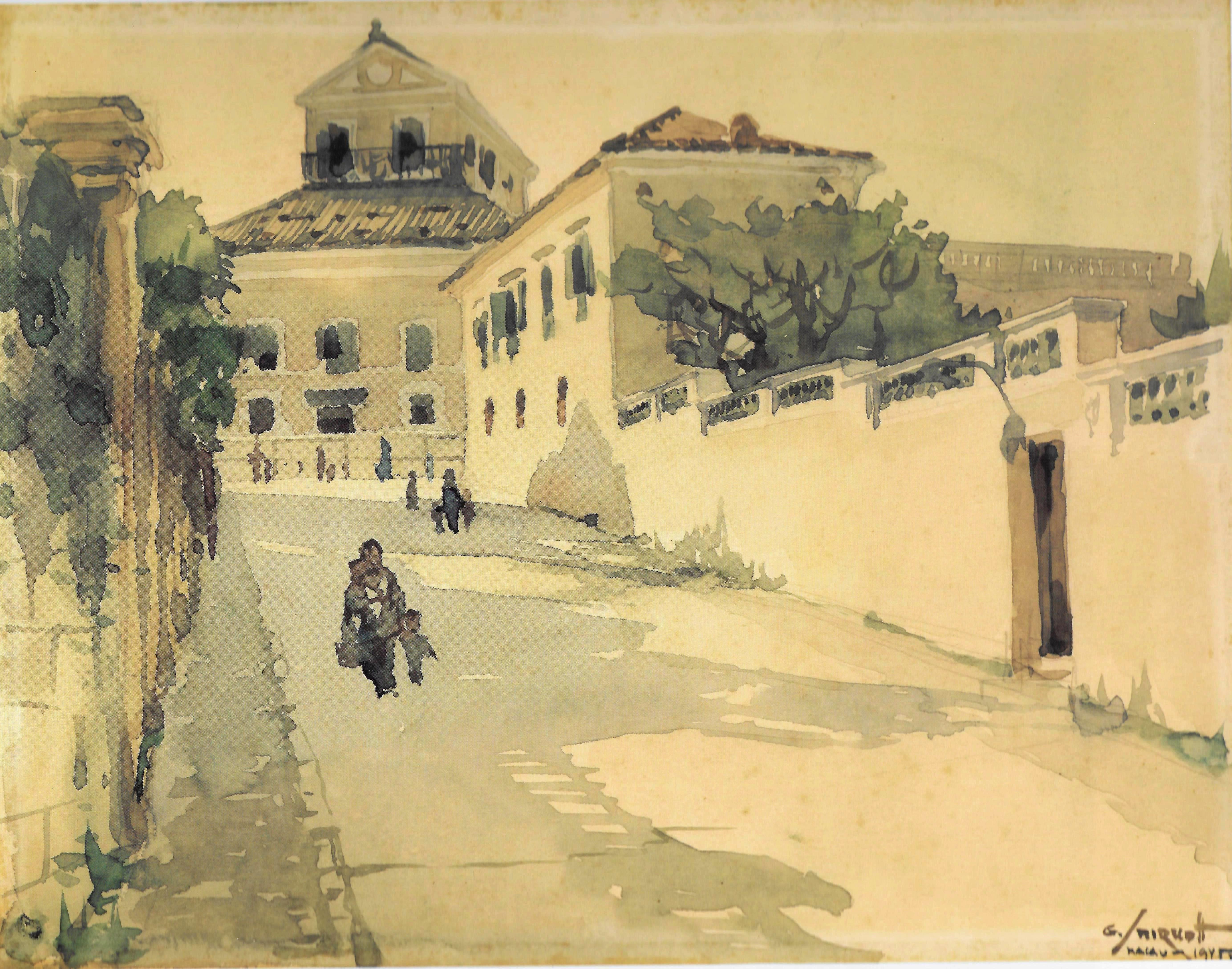 Travessa do Paiva em gravura de George Smirnoff. A casa de Arriaga no lado direito.  O edificio ao fundo, onde actualmente está a Imprensa Oficial, era o edificio da Alfândega Chinesa (conhecida por alfândega pequena), estando a alfândega grande localizada na Rua de N. Sª do Amparo (tudo já demolido). M.V.Basílio