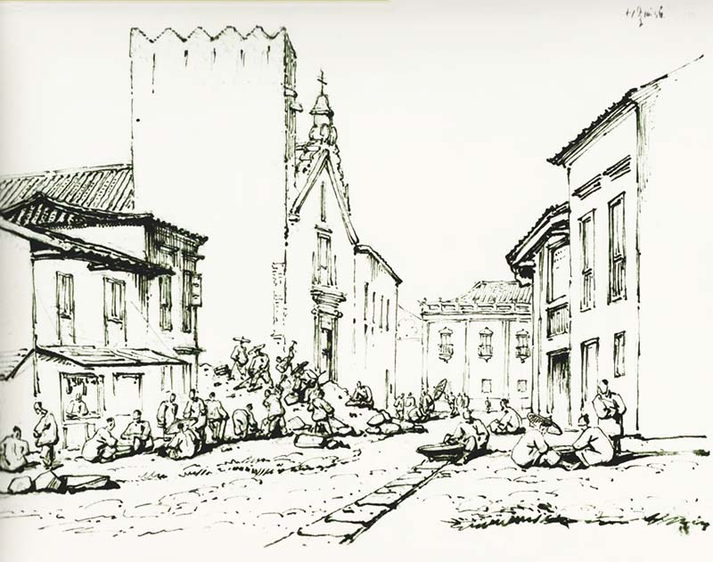 1.Desenho de George Chinnery, vendo-se parcialmente ao fundo o edifício do Leal Senado. Do lado direito, vê-se a Santa Casa de Misericórdia, com a capela e torre anexa. Ao lado da Santa Casa, estão uns trabalhadores a demolirem um prédio.