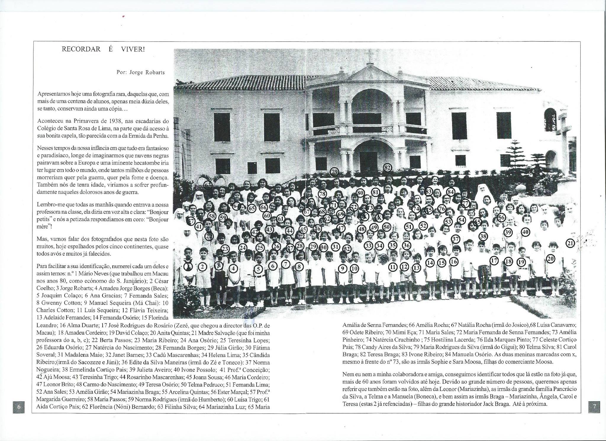 Não podia deixar de publicar esta bela recordação do Jorge ‘Giga‘ Eduardo Robarts divulgada na sua página no Facebook, que traz uma fotografia dos antigos alunos do Colégio de Santa Rosa de Lima, de Macau (ex-território de Portugal na China), que teria sido feita em 1938 ou 1939.