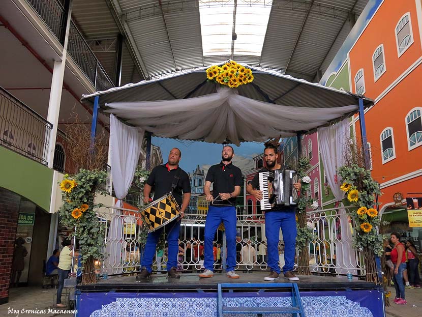 Tem um coreto com bandas a tocar músicas que dão o clima do Nordeste: