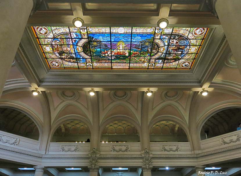 Os painéis e o vitral de Benedito Calixto, na portentosa sala do pregão, tem importância fundamental na tradução visual deste discurso: no tríptico, o pintor imagina a cena de leitura do foral da Vila de Santos por Braz Cubas; nos painéis laterais, a representação da Vila de Santos em 1822 em comparação à cidade em 1922; e, finalmente, o vitral que cria – com bandeirantes, a agricultura, o porto, e o café – uma mitologia da nação.(Wikipédia)