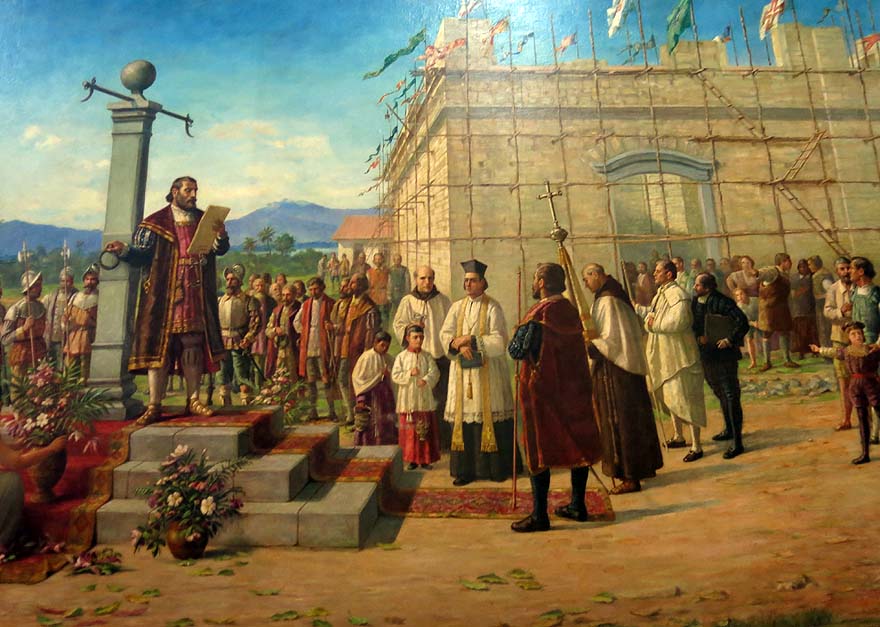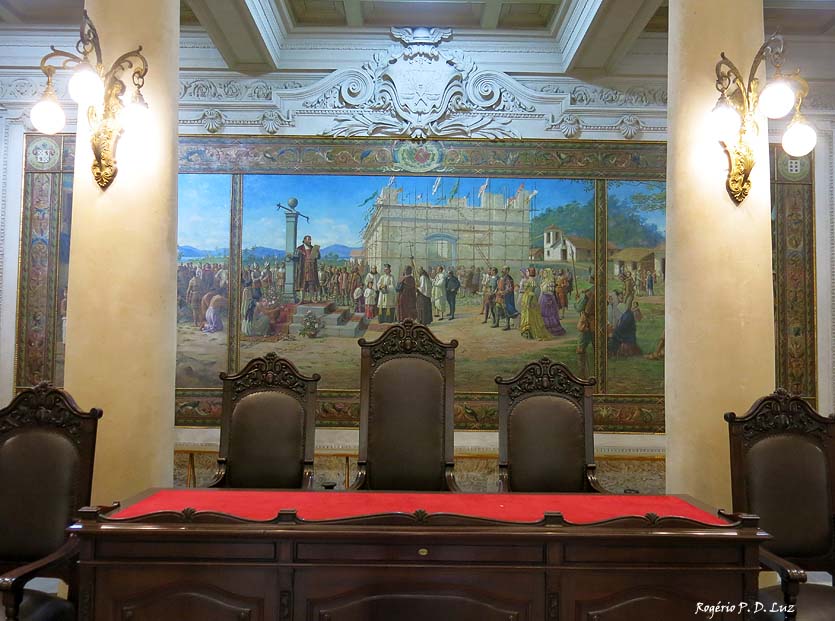 “Fundação da Villa de Santos – 1545 – o capitão Braz Cubas lendo o floral da Villa e inaugurando o Pelourinho no pateo da Casa do Conselho” (transcrição do texto no quadro)