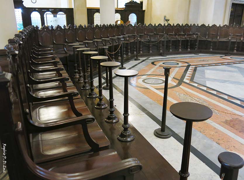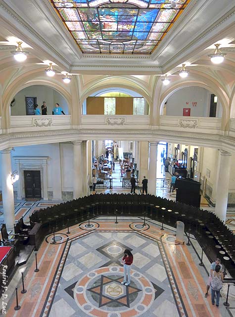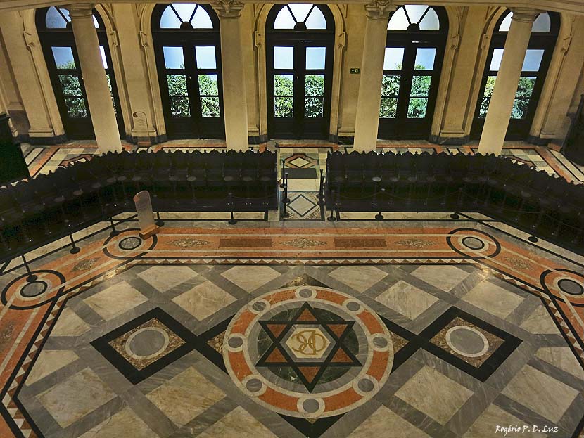 Todo esse complexo e denso conjunto de informações, aliados a diversos símbolos maçons – como a estrela de seis pontas (foto abaixo) no chão do pregão, a organização do cadeiral e as colunas – passam uma clara mensagem da força da presença do café na riqueza do Brasil.(Wikipédia)