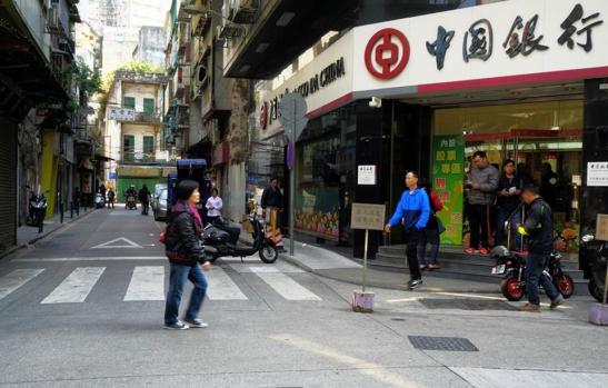 Foto da Rua do Infante, tirada na Rua de Cinco de Outubro. Ao fundo, a Rua dos Faitiões, e na esquina do lado direito, uma dependência do Banco da China. Foto M.V. Basílio