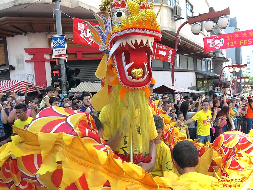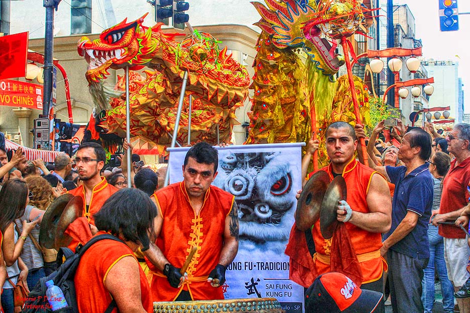 Neste ano, pode-se perceber uma evolução do desfile que dá início à festa nos dois dias da programação, com maior número de participantes e figurinos. O público vibra, procura tocar nas fantasias, diria que é para dar sorte, tira fotos de tudo quanto é jeito, apesar do aperto na Rua dos Estudantes e a Praça da Liberdade. Praticamente essas academias são compostas por brasileiros, de aparência ocidental, tendo o mínimo de orientais, apesar da grande população chinesa que deve passar de 200 mil imigrantes. Isso, acredito, deve ter contibuído para uma melhor identificação com o público. Os chineses ficaram limitados às apresentações no palco.