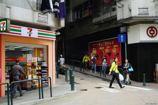 A placa toponímica no canto superior direito assinala o início da Rua da Praia do Manduco, do lado da numeração ímpar. A rampa é a Calçada do Januário. A placa toponímica colocada no lado esquerdo, por cima da loja 7 Eleven, indica o início da Rua de João Lecaros.