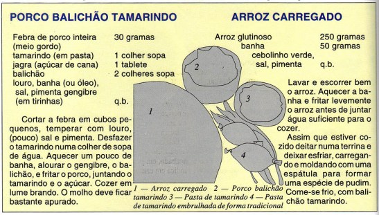 Mais abaixo, estão as receitas de Porco Balichão Tamarindo e do Arroz Carregado. A receita do Tacho (Chau Chau Pele) pode ser visualizada nesta postagem (clicar aqui).