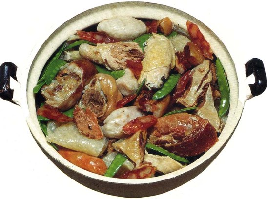 É petisco consumido por gente que sabe muito bem escolher o restaurante, os ingredientes (que variam), os convivas, e que reserva com antecedência prévia o “acontecimento” para que tudo se apresente na perfeição. Reúne muito do que voa, nada, rasteja, trepa e anda com as quatro patas no chão, mas não faça apostas quanto ao seu conteúdo. Nele participam (lentamente cozinhados em banho-maria) ingredientes como o frango, presunto, barbatanas de tubarão, cobra, veado, holotúria e acelgas.