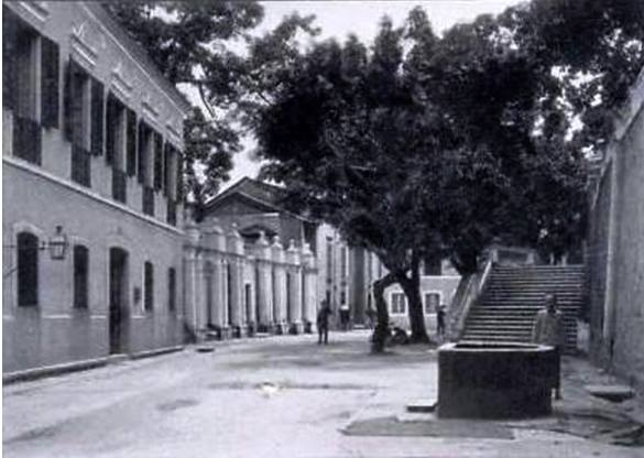 Rua do Padre António ca. 1946, vendo-se ao fundo, parcialmente, as duas torres da igreja de S. Lourenço. No canto superior esquerdo, vê-se parcialmente a tabuleta da parteira Ng Sin Si (veja comparativo na foto abaixo).