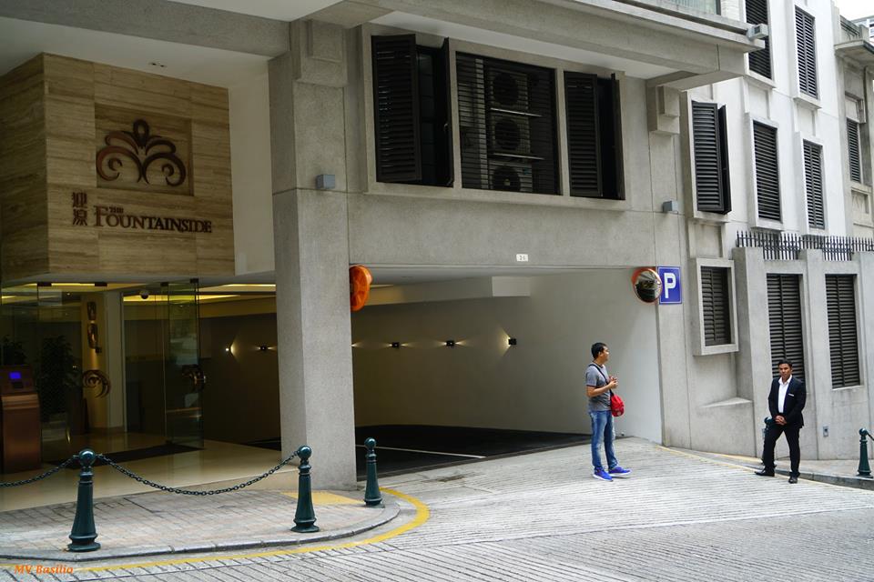 Do lado esquerdo, vê-se uma porta de vidro, que é a entrada para as moradias do edifício “THE FOUNTAIN SIDE”. Do lado direito, é o acesso para o parque de estacionamento, destinado aos moradores.. Foto M.V. Basílio
