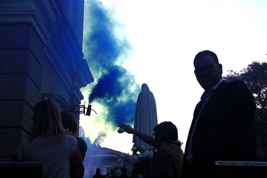 Mesmo com claridade de dia, percebia-se uma iluminação colorida a enfeitar a fachada. Veja as últimas fotos quando à noite.