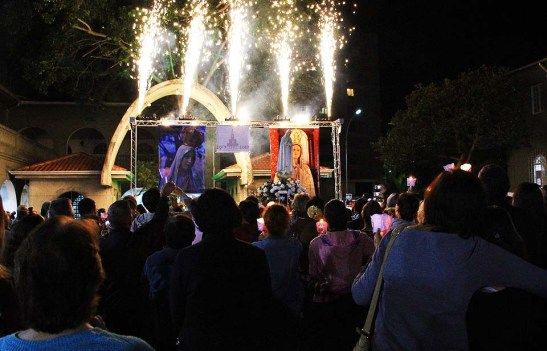 Ao final da procissão pelas ruas, a Imagem Peregrina ingressa no pátio da igreja para as orações e celebrações finais com queima de fogos.
