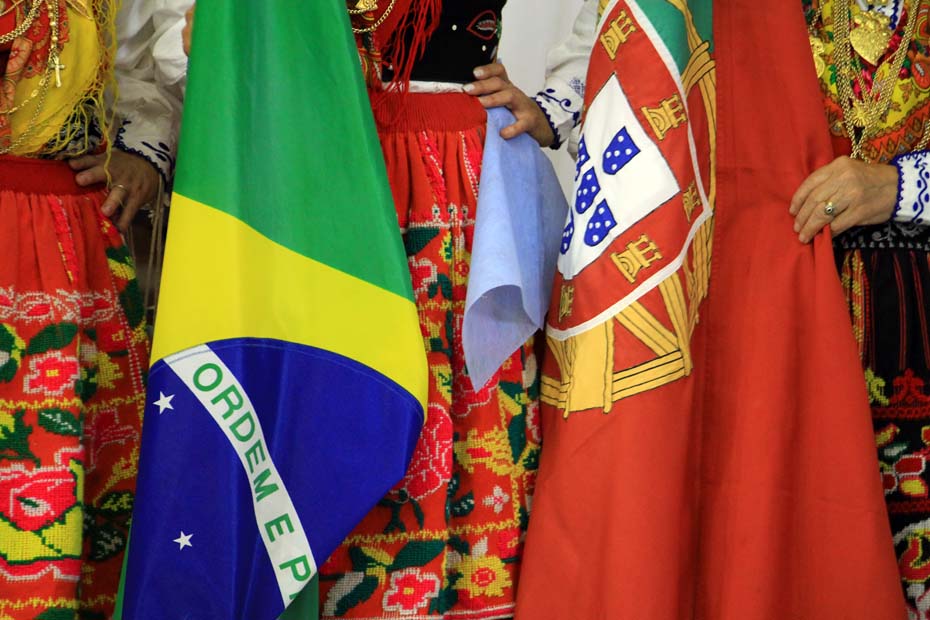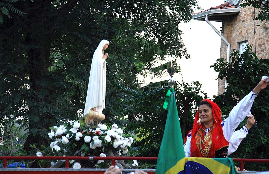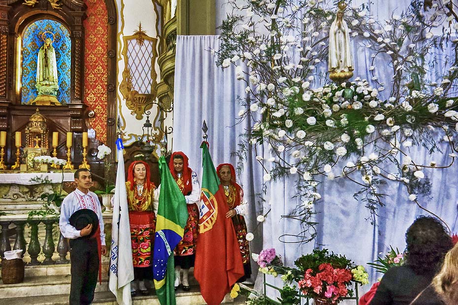 A bordo, três mulheres e um homem vestidos de trajes regionais portugueses acompanhavam a imagem portando as bandeiras do Brasil e de Portugal.
