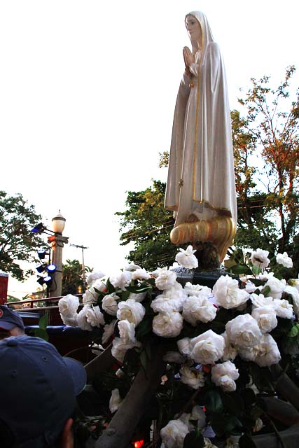 A chegada da imagem peregrina de Nossa Senhora de Fátima em carro dos Bombeiros acompanhada por batedores da Polícia Militar