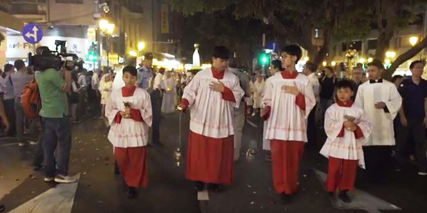 A procissão em Macau é bem organizada, com alas e vestes apropriados, estandartes, mulheres com véus e vestidas de branco, incensos, velas acesas, etc. Uma tradição por anos!