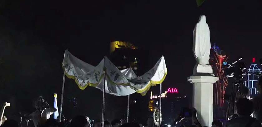 Pelos luminosos em chinês, Nossa Senhora de Fátima percorre pelas ruas da Macau, hoje chinesa. Imagem do vídeo da Macau News