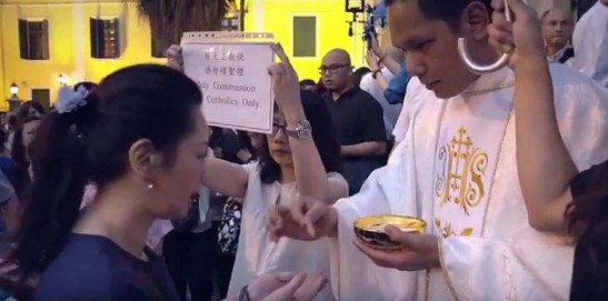 Na comunhão dada na área externa da Catedral, a placa explica que é somente para católicos, visto que curiosos ali não entendam o que é o sacramento. Imagem do vídeo da Macau News