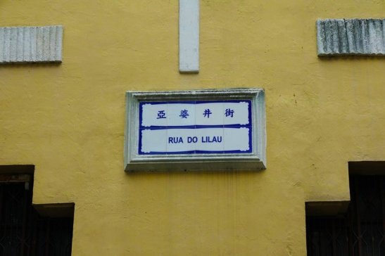 Placa toponímica do Beco do Lilau, em chinês, Lông T’au Lei (龍頭里, Beco de Cabeça de Dragão) ou Lông T’au Hong (龍頭巷, Travessa de Cabeça de Dragão. Foto M.V. Basílio