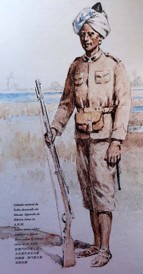 Soldado natural da Índia destacado para Macau. Aquarela/aguarela de Ribeiro Artur in A.H.M. Origem: Livro- 400 Anos de Organização e Uniformes Militares de Macau/Instituto Cultural de Macau/Manuel A.Ribeiro Rodrigues
