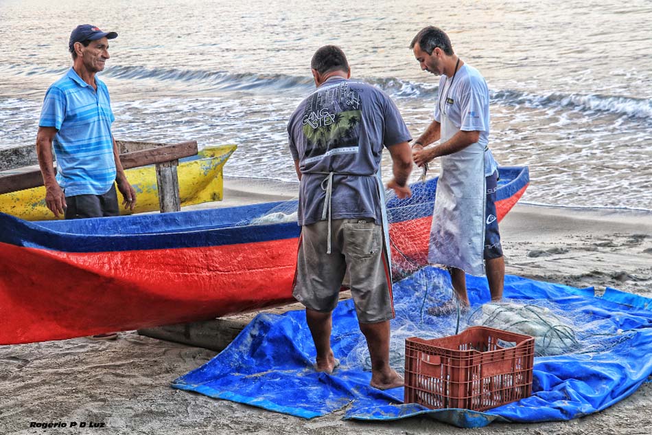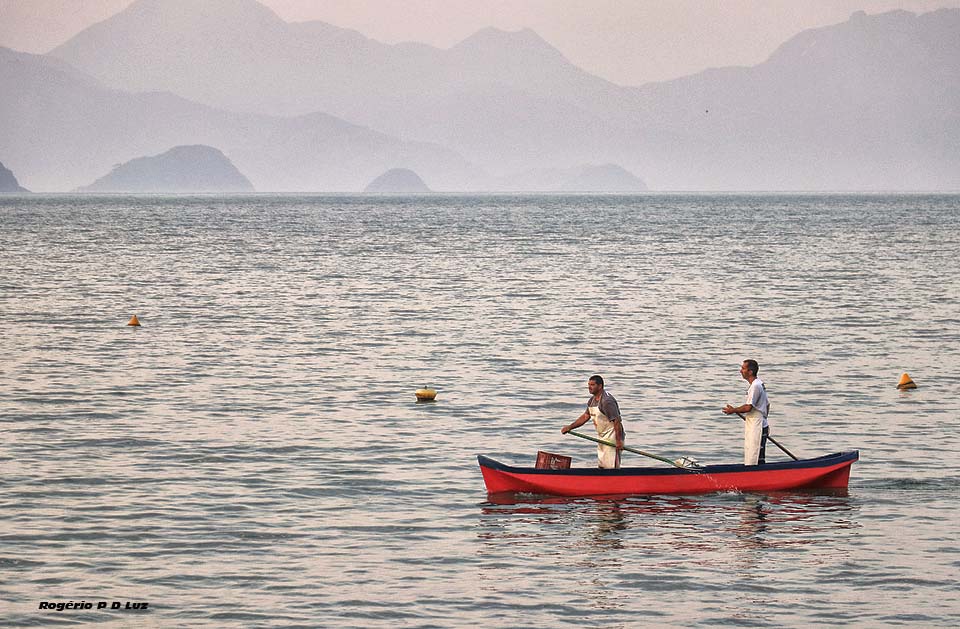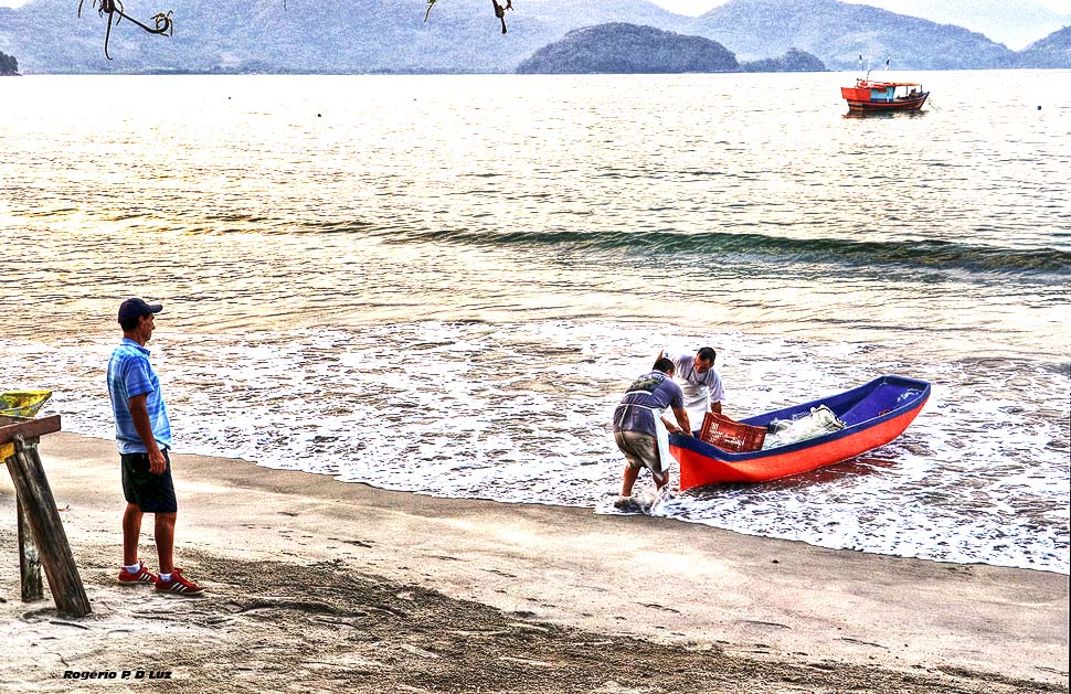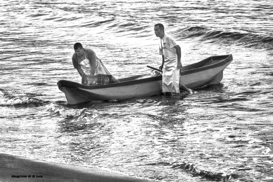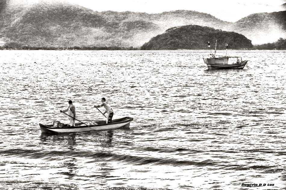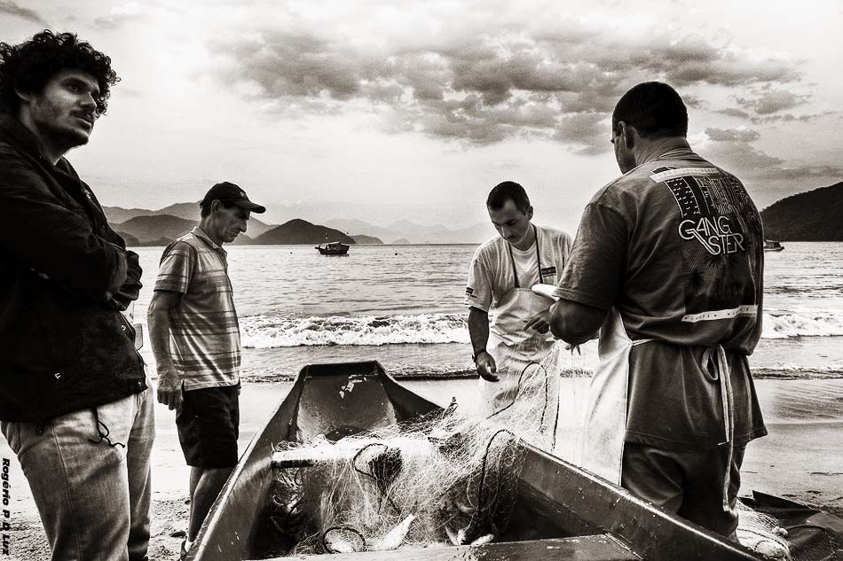 Após pescaria com rede nas águas de Ubatuba, litoral norte de São Paulo, dois pescadores numa canoa retornam à sua base na praia de Itaguá localizada na zona urbana, trazendo a bordo peixes na maioria ‘parati’. Este é o tema do ensaio fotográfico que fiz no final de tarde de uma quarta-feira do inverno de 2017, no mês de agosto.