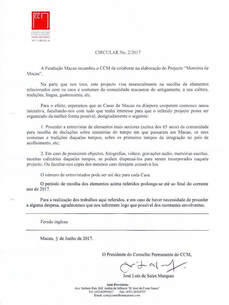 A Circular do Conselho das Comunidades Macaense de 05/Junho/2017 sobre o seu Projecto Memória de Macau distribuída às associações macaenses