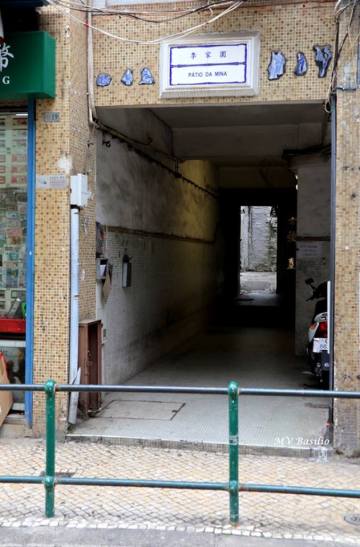 Aspecto actual do Pátio da Mina, em chinês, Lei Ká Wâi 李家圍 (literalmente, Pátio da Família Lei). Este Pátio está situado junto da Rua de Nossa Senhora do Amparo. Na parte tardoz deste Pátio ainda se podem ver vestígios da entrada de um túnel subterrâneo que, segundo dizem, ia até ao Colégio de S. Paulo. Foi junto ao Pátio da Mina o local onde se situava o Hopu ou alfândega chinesa da Praia Pequena, que ali funcionou até ser extinto por ordem do Governador Ferreira do Amaral. (Foto: MV Basílio)