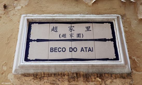 Placa toponímica do Beco do Atai, em chinês, Chiu Ká Lei 趙家里 que, literalmente, significa Beco da Família Chiu. Os caracteres chineses que estão escritos entre parênteses lêem-se Chiu Ká Wâi 趙家圍 , isto é, Pátio da Família Chiu, como era anteriormente conhecido. Este Beco está situado junto da Rua das Estalagens. (Foto: MV Basílio)