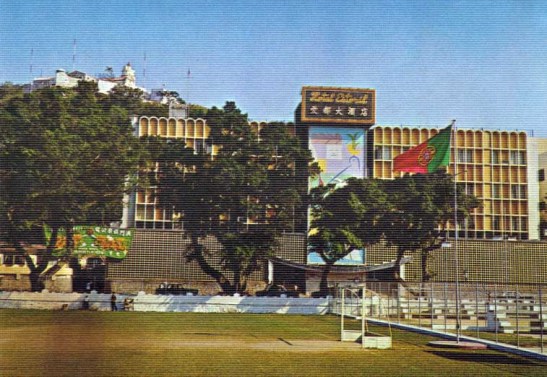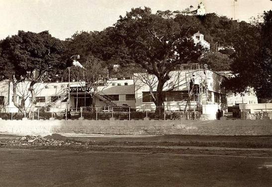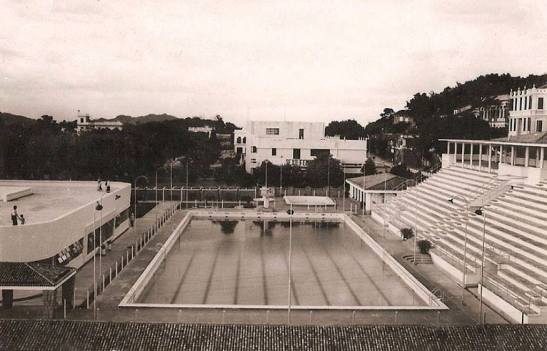 A piscina municipal, inaugurada em 1952. Do lado esquerdo, pode-se ver o restaurante-bar e o salão de dança Clube Nocturno Sân Fá Yün, antes de ser demolido. Ao fundo, a Escola Central (Escola Primária Oficial). (Foto baixada da internet)