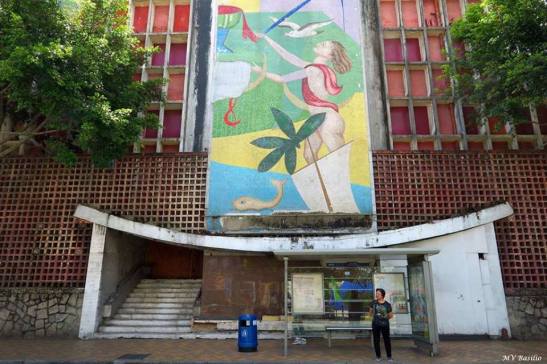 A porta principal do Hotel, com duas entradas: a do lado esquerdo, subia directamente para a Recepção do Hotel e, a do lado direito (não visível nesta foto, por causa do abrigo ou postalete da paragem de autocarros) dava acesso ao Casino. A estrutura arqueada, por baixo do mural, era a que chamavam “lâmina da guilhotina”, construída com esta configuração, por razões de “feng shui”. Foto MV Basílio