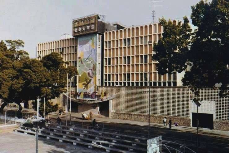Edifício do restaurante-bar e o salão de dança Clube Nocturno Sân Fá Yün, que foi demolido para dar lugar à construção do Hotel Estoril. Do lado direito, pode-se ver o acesso pelo portão de ferro à piscina, bem como o espaço onde posteriormente foi construída a Ala Nova do Hotel. (Foto baixada da internet, do grupo Antigas Fotos de Macau)