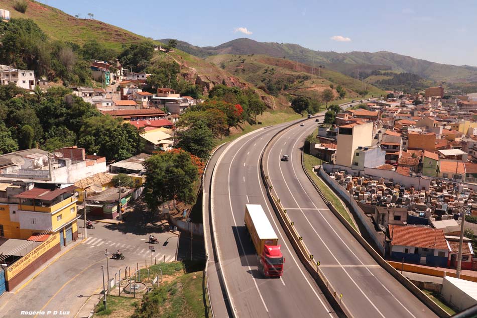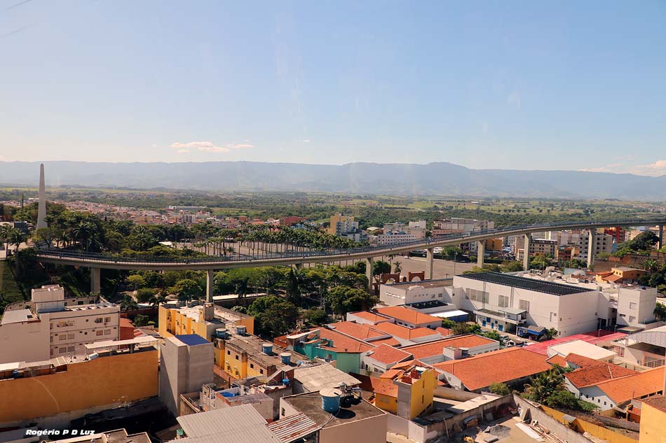Na passagem sob o viaduto da Via Dutra o acesso ao Mirante do Cruzeiro. O telefériro passa a cerca de 40 metros de altura da rodovia.