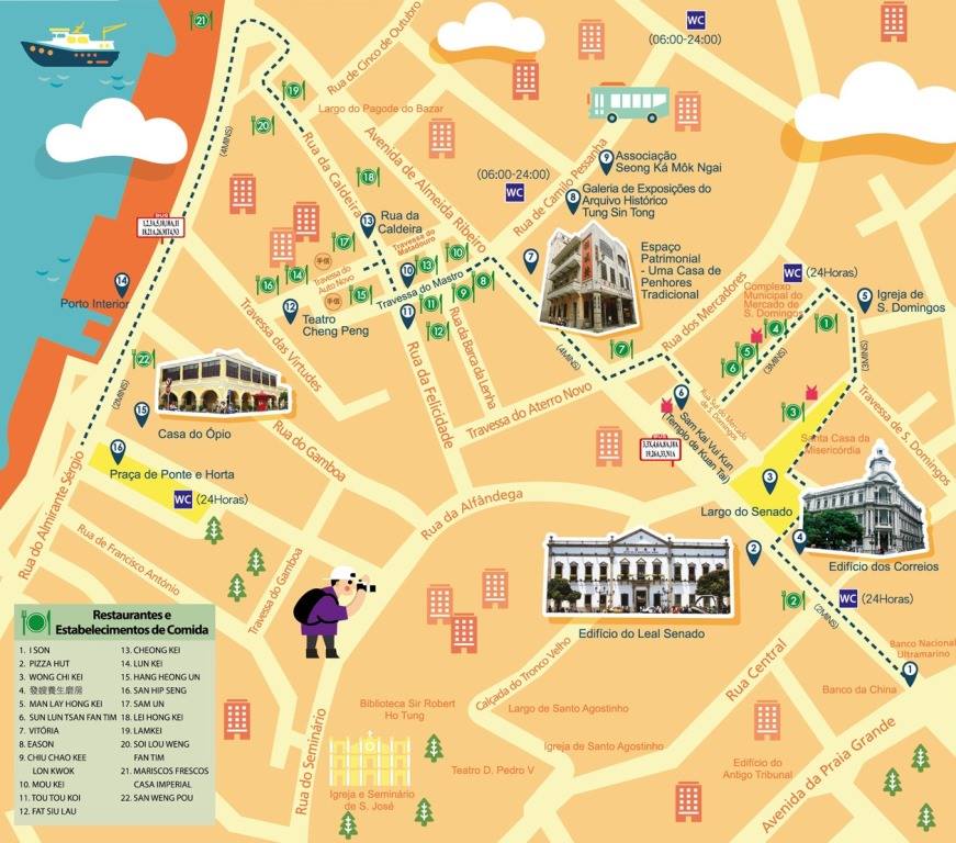 Mapa turístico, vendo-se na parte superior (onde está o desenho de um autocarro) a localização da Rua de Camilo Pessanha, que faz junção com a Avenida de Almeida Ribeiro