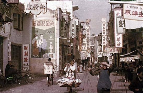 Aspecto da Rua de Camilo Pessanha, nos anos sessenta do século passado, vendo-se em destaque o letreiro publicitário de tintas da marca Camel, do estabelecimento Tintas e Óleos Iek Vo, o único que era iluminado à noite. Do lado esquerdo, vê-se uma publicidade, pintada na parede, da adega de vinhos chineses “Kou Kam Kei Châu Chóng (高金記酒莊), e onde estão as bicicletas, pode-se ver parcialmente o dístico comercial da Carvoaria Un Wo. Do lado direito, vê-se uma das tendinhas de comidas, montada na rua. (Foto baixada da internet, de Antigas Fotos de Macau)