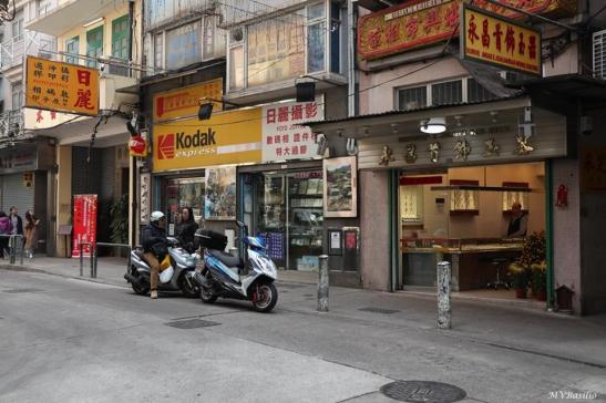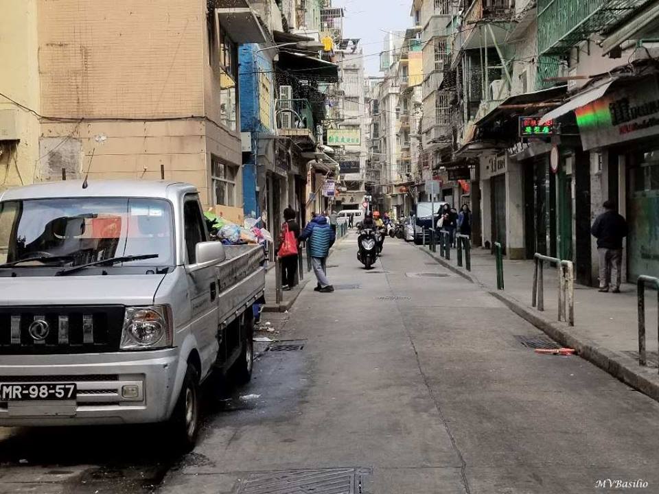 Um troço da Rua de Camilo Pessanha nos dias de hoje, praticamente sem aqueles letreiros publicitários dos anos sessenta do século passado, como mostra a foto anterior. Do lado esquerdo, apesar de ser um prédio reconstruído, ainda está a parede, em que estava pintada aquela publicidade da adega de vinhos chineses “Kou Kam Kei”. Foto MV Basílio