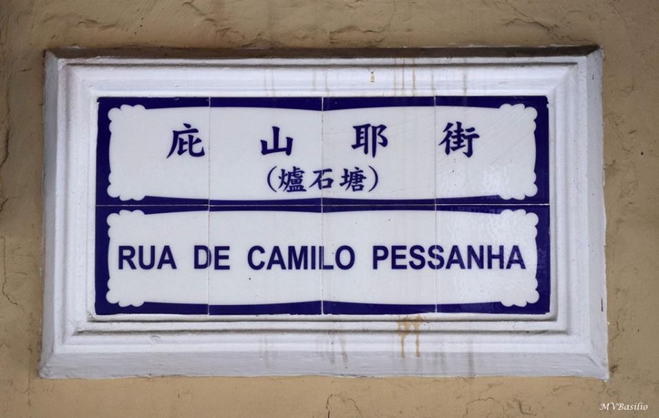 Placa toponínica da Rua de Camilo Pessanha, em chinês, 庇山耶街 (Pei SánYé Kai, sendo Pei Sán Yé a transliteração fonética de Pessanha), cuja via também é conhecida por “Lou Sék T’óng” (爐石塘), como constam dos caracteres chineses escritos entre parêntesis. Foto MV Basílio