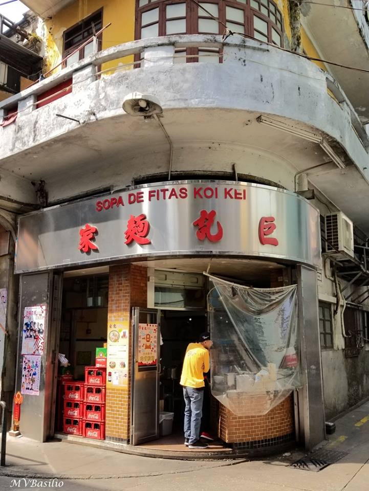 Esta loja de Sopa de Fitas Kôi Kei (巨記麵家 ) é muito antiga e quando começou o seu negócio era apenas uma tendinha, montada junto ao prédio do estabelecimento de Tintas e Óleos Iek Vo. Apesar de o dístico comercial ser novo, a disposição dos caracteres chineses mantém-se na forma antiga, por isso são lidos da direita para a esquerda. Hoje em dia, a escrita chinesa já é feita da esquerda para a direita. Foto MV Basílio