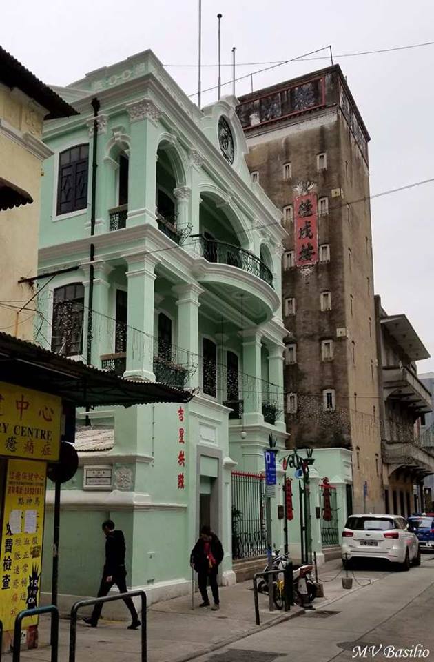 O edifício de cor esverdeada é a Casa de Beneficência “Tung Sin Tóng” e, a seguir, vê-se a torre prestamista da Casa de Penhores Tak Seng On (德成按). Foto MV Basílio