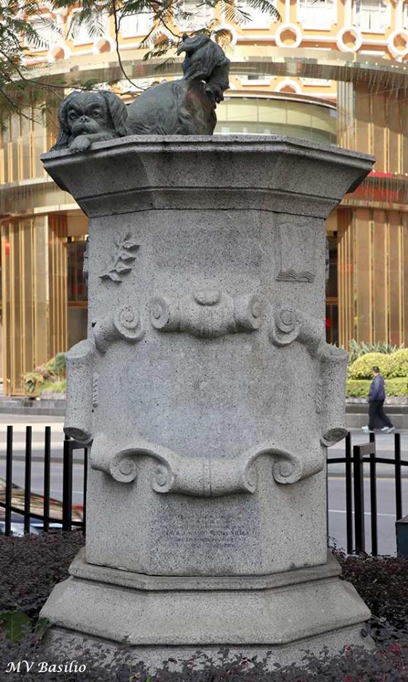 Estátua de Camilo Pessanha no Jardim das Artes. Vê-se na foto que Camilo já “desceu” do pedestral, enquanto que o seu fiel companheiro, o Arminho, continua agachado lá em cima a ver o seu dono ou a preparar-se para dar o salto. Foto MV Basílio