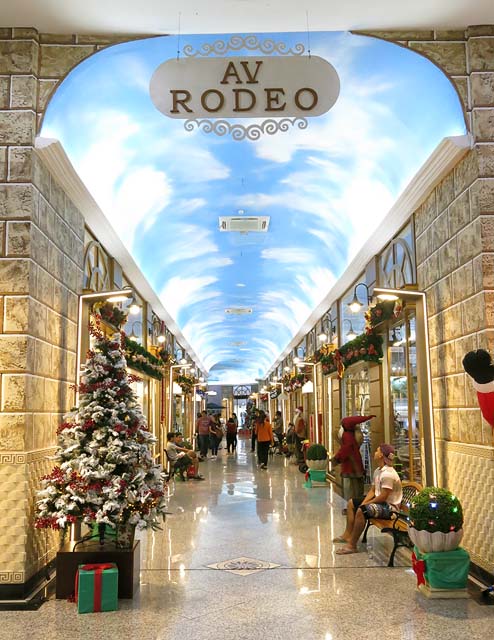 Um corredor de lojas chamado de Av. Rodeo com teto pintado de céu azul com nuvens