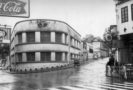 Outro aspecto da Rua do Campo, em que se vê o edifício do cinema Império antes de ser demolido. O portão de ferro do lado direito era a entrada da Escola para Filhos e Irmãos da Associação das Mulheres de Macau.