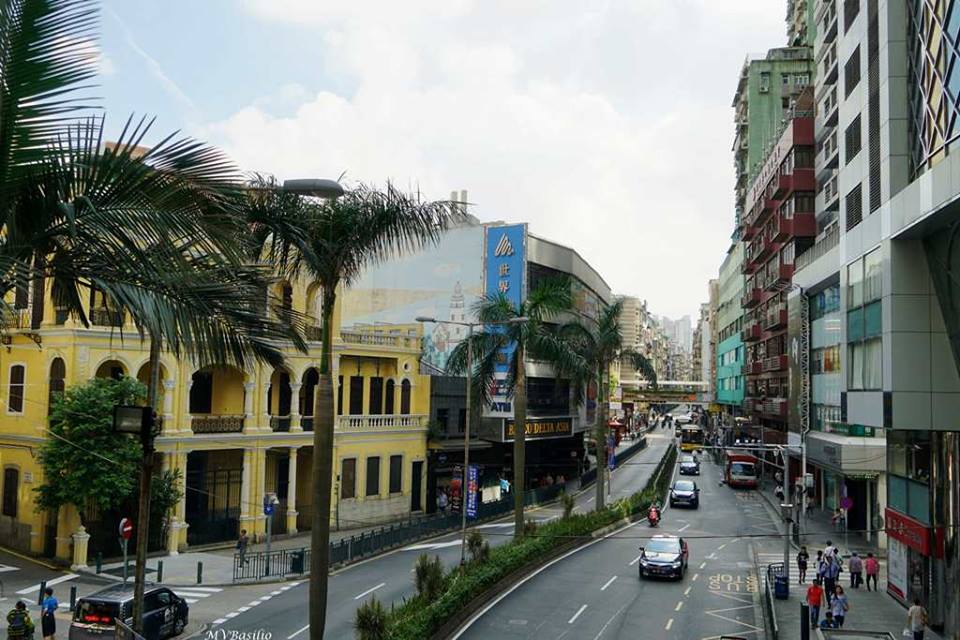Do lado esquerdo, é a Rua do Campo e, do lado direito, a Rua de Pedro Nolasco da Silva (anteriormente, Rua do Hospital). O edifício ao centro é o Banco Delta Ásia, construído no terreno resultante da demolição do antigo edifício das Obras Públicas. Foto MV Basílio