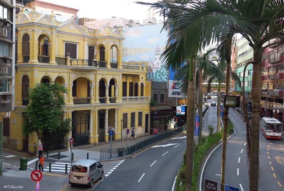 Rua do Campo, vendo-se do lado esquerdo a mansão de Kou Ho Neng, pintada de amarelo. Do lado direito, vê-se parcialmente, em primeiro plano, o Edifício Administração Pública