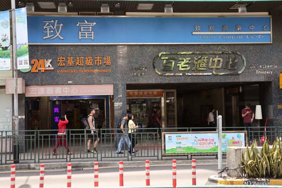 Entrada do edifício denominado Centro Comercial Broadway, construído no terreno resultante da demolição do antigo cinema Império. Actualmente, funcionam nesse edifício vários estabelecimentos, designadamente o Centro Comercial Chi Fu, o Supermercado Vang Kei e a Livraria Wan Tat. Foto MV Basílio