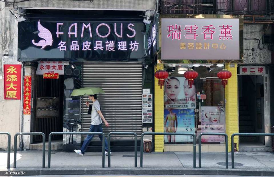 Do lado direito, era uma antiga mercearia, denominada Mán Lei Hóng, que já cessou há muito a sua actividade, mas ainda não foi retirado o dístico comercial. A loja do centro está devoluta, com um anúncio para arrendamento ou venda. Mesmo ao lado de Mán Lei Hóng, era um prédio de 3 pisos, já demolido, onde estavam a Tipografia Progresso e a Leitaria Nam Mei, no r/c (rés-do-chão/térreo). Foto MV Basílio